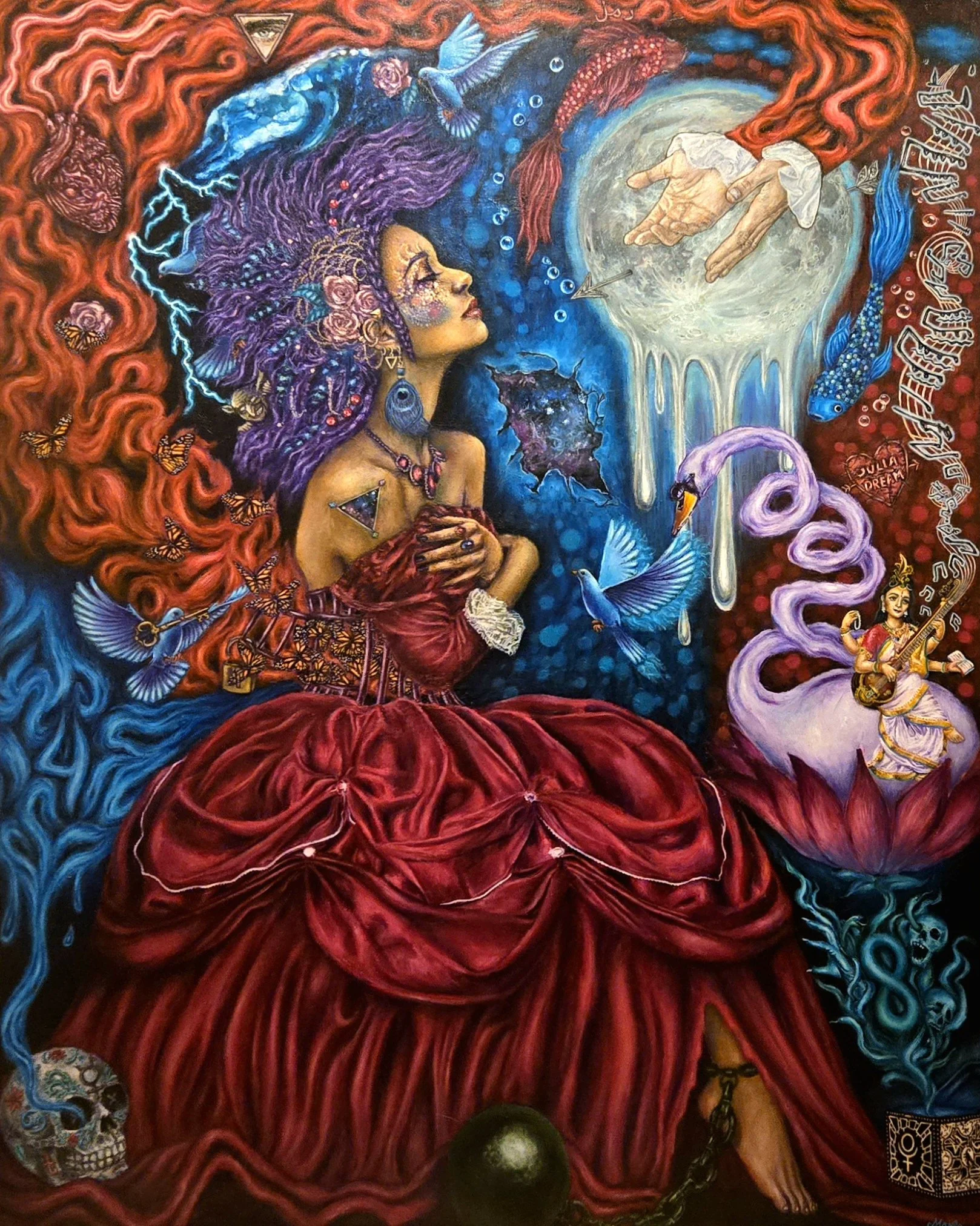 This painting was based on a period leading up to my spiritual awakening. It displays a dreamlike realm that encapsulates the complexities of my subconscious mind at the time. The bold, swirling colors create an ethereal atmosphere, giving the overall mood of the painting one of bittersweet yearning. The woman, though radiant and divine, seems to be shrouded in a veil of distance, symbolizing the love that feels just out of reach. This distance evokes a profound sense of sorrow, where one feels caught in a liminal space between longing and despair.
